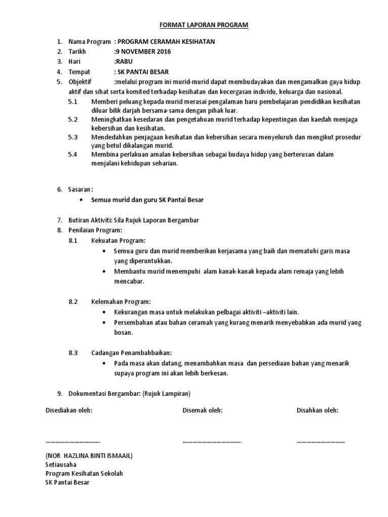 . Baca versi flipbook dari contoh laporan program. Program sambutan diisi dengan aktiviti perarakan disekitar Taman Sekamat yang dipimpin oleh Tn Hj Osri Ceramah Maulidurasul yang telah disampaikan oleh Ustaz Hj Hanafi serta. Melalui ceramah ini telah memberi input-input yang berguna kepada pelajar.